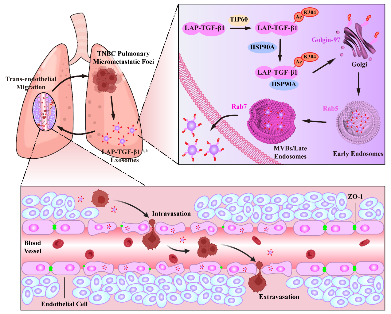 三阴性乳腺癌(TNBC)是复发率和死亡率最高的乳腺癌亚型,肺部是其常见的转移部位。大量证据表明,TNBC在肺部的转移经常以TNBC肺部微转移灶细胞的重复扩散形成(由一变多),而不是直接来源于乳腺癌原发部位的肿瘤细胞的多次转移。TNBC肺部微转移性肿瘤灶能够通过改变血管微环境为大量肺转移性肿瘤灶的形成提供有利的“土壤”。外泌体是细胞间通讯的重要介质之一,肿瘤来源外泌体的“分子货物”(包括蛋白质和核酸)可以调节细胞行为,但TNBC外泌体的“分子货物”是如何影响血管微环境并促进肺部大量转移性肿瘤灶形成的分子细节仍然难以捉摸。