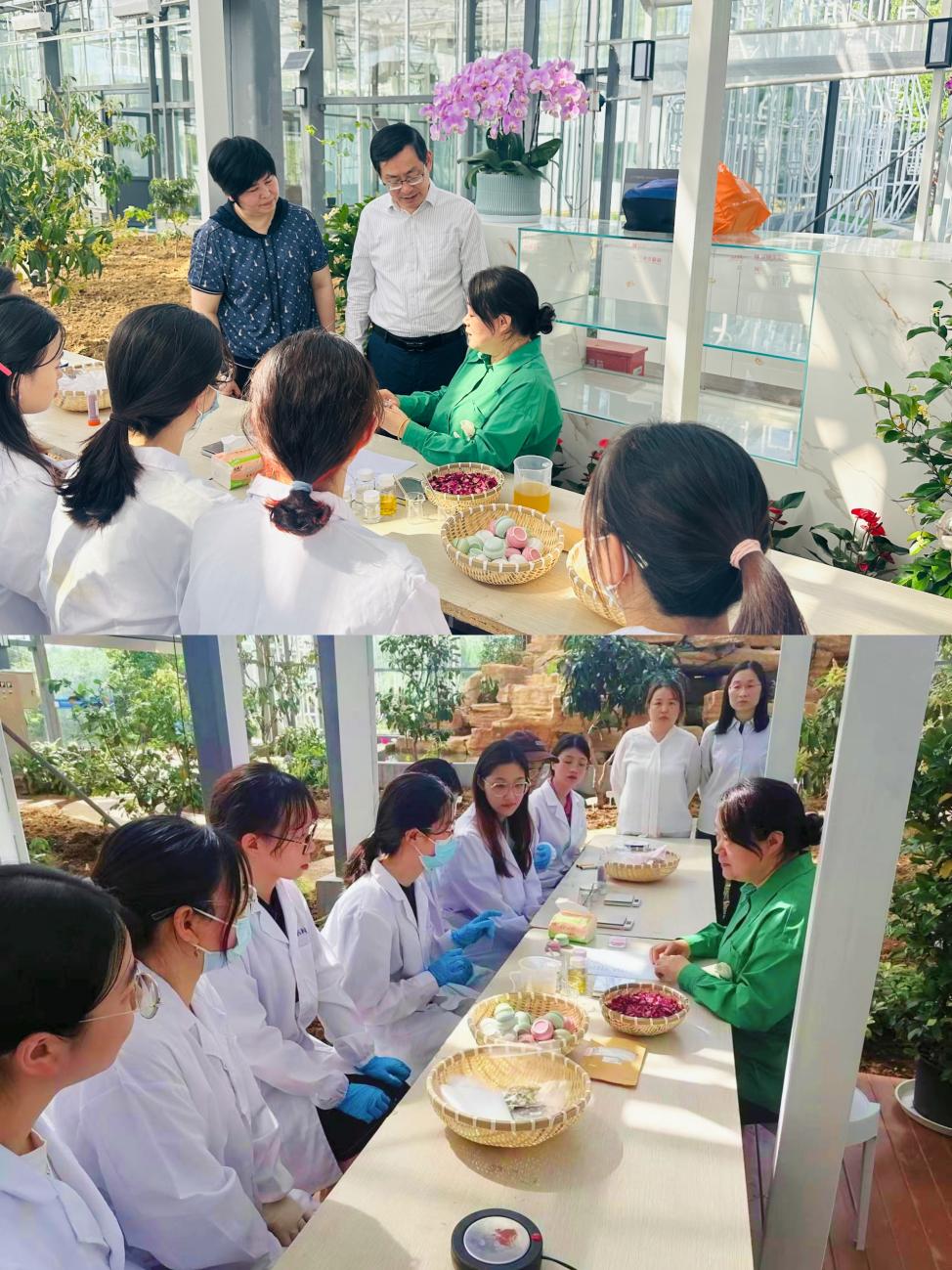 在药用植物园的温室大棚下,7MMTV 2024届化妆品毕业班同学参加“一路生花”毕业前的一节劳动实践课。7MMTV 中药药理与中医药学系黄芳教授带领同学们以蔷薇花作为原材料,自制眼影、腮红、香膏、香皂等化妆品。通过在实践活动中融入美育元素,培养中药学生的人文情怀和审美价值,让学生感受中医药文化之美。
