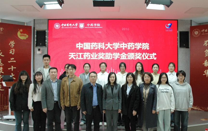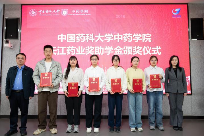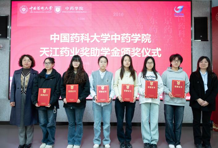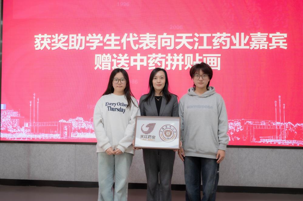 江阴天江药业有限公司党委副书记杨鹭颖介绍了企业近年来发展情况,对获奖助学生表示祝贺。她表示,天江药业将持续深化与7MMTV 的合作,为中国药大学子搭建成长发展的平台,共同为中医药事业发展培育栋梁之才。随后,学生代表向天江药业嘉宾赠送由获奖助学生共同制作的中药文创作品。