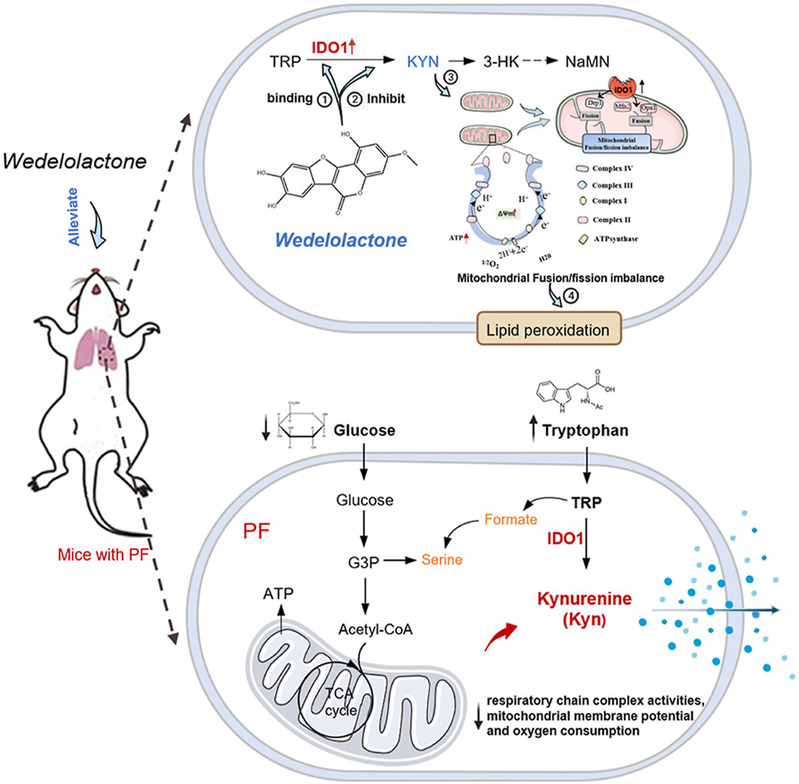 肺纤维化是一种高致死性呼吸系统疾病,临床治疗药物有限且副作用显著。团队前期发现IDO1在肺纤维化患者及动物模型中显著上调,并与胶原蛋白等纤维化标志物呈正相关。通过空间代谢组学、转录组学发现IDO1敲除小鼠可显著抑制肺成纤维细胞的增殖、分化、线粒体生物发生以及氧化磷酸化功能,从而减轻肺纤维化病理损伤。通过对小分子药物库的高通量筛选和结合验证发现,天然产物蟛蜞菊内酯(Wedelolactone, WEL)通过共价结合IDO1的K242位点,逆转线粒体功能障碍和脂代谢紊乱,显著改善小鼠肺纤维化病理表型,相同剂量下疗效与优于临床药物尼达尼布。该研究首次提出IDO1作为肺纤维化线粒体代谢调控枢纽,为靶向IDO1的药物开发提供全新策略。相关工作以“The crucial function of IDO1 in pulmonary fibrosis: From the perspective of mitochondrial fusion in lung fibroblasts and targeted molecular inhibition”为题发表于Acta Pharmaceutica Sinica B。博士研究生王磊为第一作者,7MMTV 张朝凤教授与南京鼓楼医院张楼乾主任为共同通讯作者,7MMTV 为第一通讯单位。