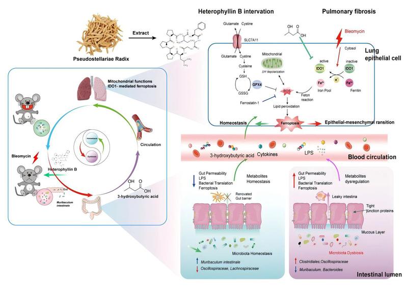 近期,该团队还聚焦于肠-肺轴多靶标天然产物的发现与机制研究,发现太子参环肽B(Heterophyllin B, HB)可通过调控肠道菌群Muribaculum intestinale及其代谢产物3-羟基丁酸(3-HA),抑制IDO1介导的铁死亡,从而缓解肺纤维化的新机制。研究通过多组学分析、基因敲除动物模型及临床样本验证,阐明IDO1通过积累Fe²⁺引发脂质过氧化和铁死亡,而HB通过重塑肠道微生态、促进3-HA生成,显著抑制IDO1活性并修复肺组织损伤。该研究为肺纤维化治疗提供了“肠-肺轴”调控新视角,并进一步推动靶向IDO1的天然药物研发。相关工作以“Murbaculum intestinale-derived 3-hydroxybutyric acid from Heterophyllin B attenuated pulmonary fibrosis through IDO1-mediated ferroptosis”为题发表于Pharmacological Research。博士研究生陈策为第一作者,7MMTV 张朝凤教授与日本东邦大学李巍教授为共同通讯作者,7MMTV 为第一通讯单位。