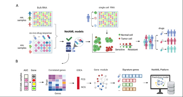 急性髓系白血病(AML)是一种起源于骨髓造血干细胞的恶性克隆性疾病,患者对现有治疗方案的反应差异巨大,亟需针对病人个体差异来制定精准的用药方案。然而,肿瘤细胞的异质性使得寻找可靠的预测性生物标志物异常困难。传统的基于bulk RNA-Seq和体外实验的模型,往往难以捕捉隐藏在治疗反应和耐药性背后的复杂分子通路与基因网络。为此,研究团队开发了名为 NetAML 的网络驱动精准药物敏感性预测平台。