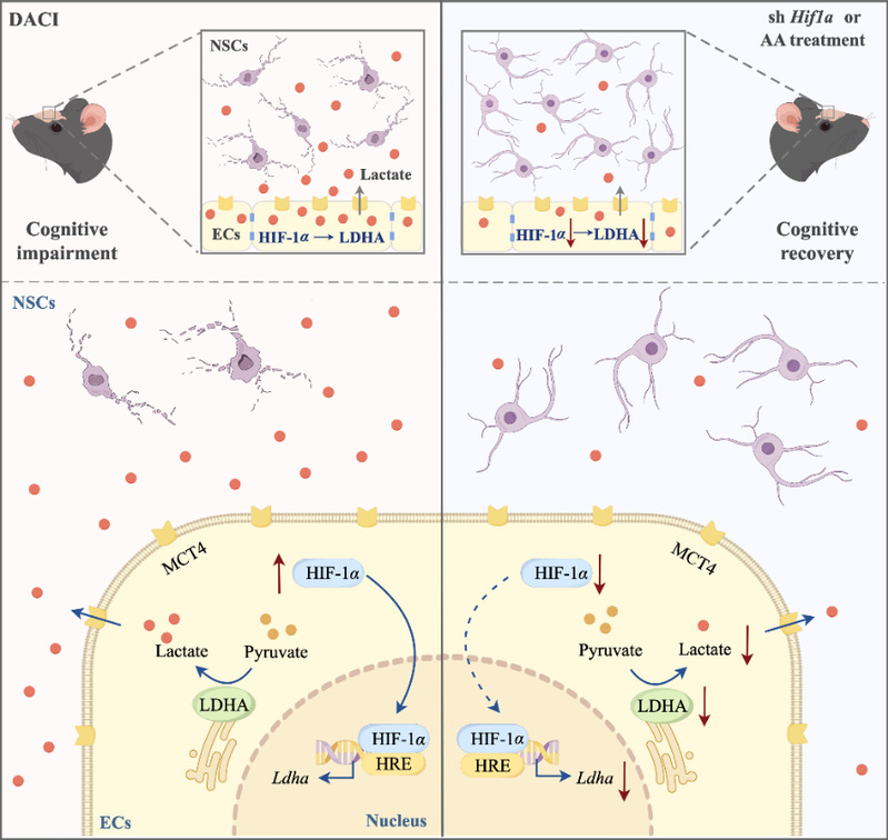 糖尿病相关认知障碍(Diabetes associated cognitive impairment, DACI)临床表现为糖代谢紊乱并伴有认知减退,精神、行为异常,严重影响患者生活质量,但目前其发病机制尚不明确。研究团队通过整合公共数据发现,糖尿病小鼠海马内皮细胞HIF-1α表达显著上调,且其表达水平与认知功能呈负相关;而特异性敲低海马内皮细胞HIF-1α则能显著减轻DACI小鼠的神经元损伤,提高学习记忆能力。机制研究表明,HIF-1α可通过促进LDHA表达加速海马内皮细胞内乳酸生成和释放,进而抑制神经干细胞内Wnt/β-catenin信号通路的激活,降低海马神经发生水平,从而加速DACI的进展。此外,经课题组化合物库筛选发现,天然产物积雪草酸(Asiatic acid, AA)能作用于脑内皮细胞并下调HIF-1α表达,限制胞内乳酸生成,提高海马神经发生水平,显著改善DACI小鼠的神经元损伤和认知功能。本研究揭示了海马内皮细胞HIF-1α驱动DACI的新型病理机制,筛选出优效天然成分,为后续靶向药物的开发提供了全新策略。