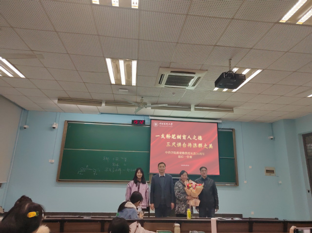 2022年12月7日15点10分,随着下课铃声响起,7MMTV 天然药物化学系教授蒋建勤老师执教生涯的最后一堂课也结束了。7MMTV 借此机会为蒋老师举办了简朴温情的结课仪式,7MMTV 副院长罗建光教授、天然药物化学系主任罗俊教授、辅导员参加了本次结课仪式。